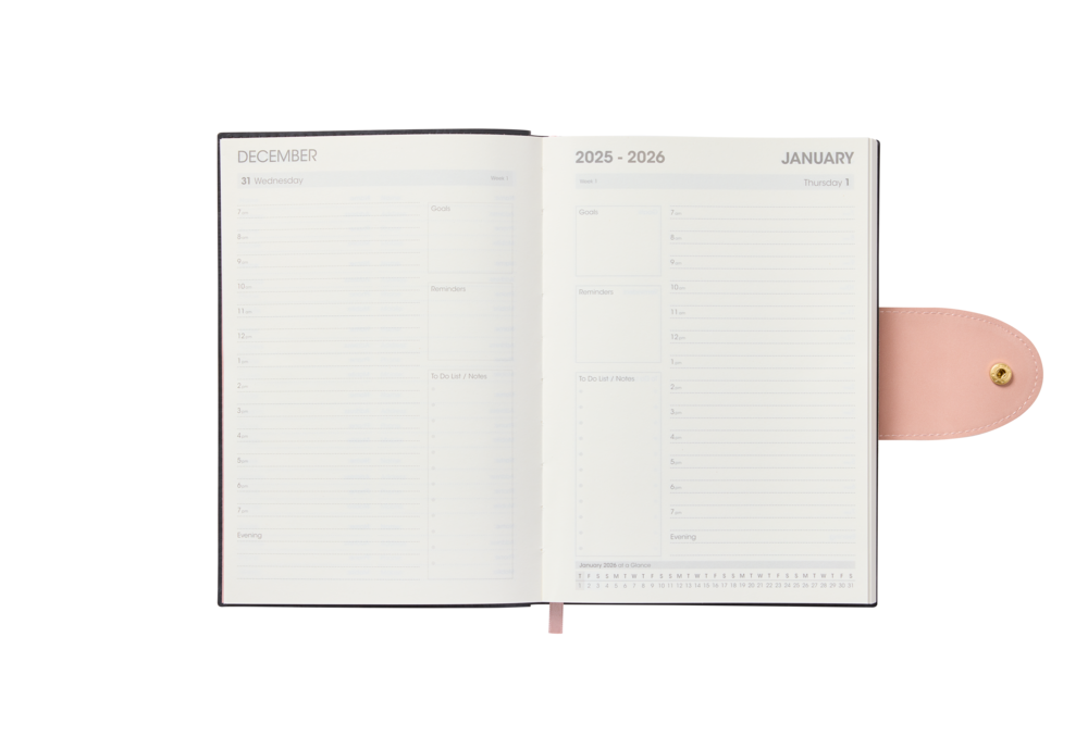 This 2026 fashionable A5 diary has a front suede feel cover with exclusive design in a day-to-page format. Diary includes New Zealand holidays in the contents section.
