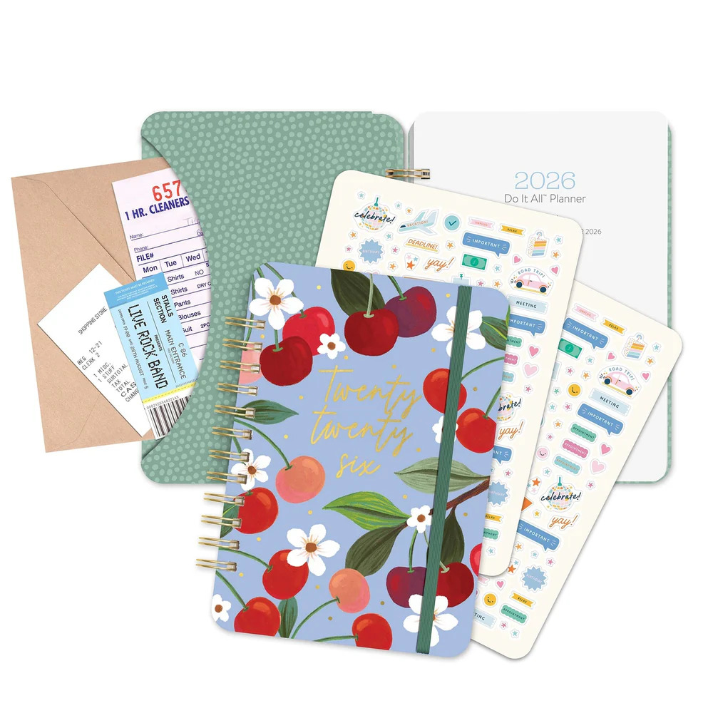 Stay effortlessly organized even with a full calendar using the Do It All Fruit and Flora Planner, a best-selling A5 favourite designed to manage busy lives with charm and ease. Featuring cheerful fruit-and-floral cover art and packed with practical tools, this planner is your go-to companion from August 2025 through December 2026. With spacious weekly spreads that include dedicated planning space for up to six family members, this planner makes it easy to track multiple schedules in one place. Whether you're managing school drop-offs, work deadlines, appointments, or meal plans, everything stays clear and coordinated. Enjoy monthly, weekly, and yearly views, along with inspirational weekly quotes to keep you motivated. Tear-off to-do and shopping lists, grid notes pages, and an easy-to-use budget tracker help you stay on top of every detail. Plus, colourful sticker sheets make planning fun and personalized. Crafted with a softcover, exposed wire-o binding, and full-colour pages, the planner includes 226 pages printed on high-quality paper. It also features a storage pocket, elastic-band closure, and tear-out lists all designed for busy lives on the go. Measuring approximately 146 mm wide x 210 mm high, this compact yet comprehensive planner fits easily into most bags while offering maximum functionality. Bright, practical, and designed to handle it all this planner will keep you smiling (and on track) all year long.