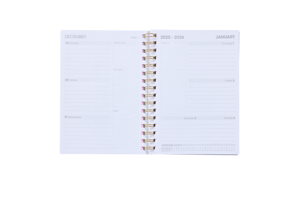 This 2026 fashionable A5 diary has a front cover with exclusive design in a week-to-view format. Diary includes New Zealand holidays in the contents section.