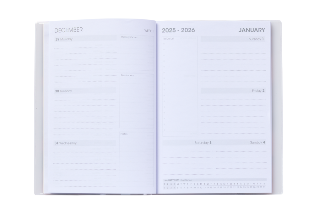 This 2026 fashionable A5 diary has a front PVC cover with exclusive design in a week-to-view format. Diary includes New Zealand holidays in the contents section.