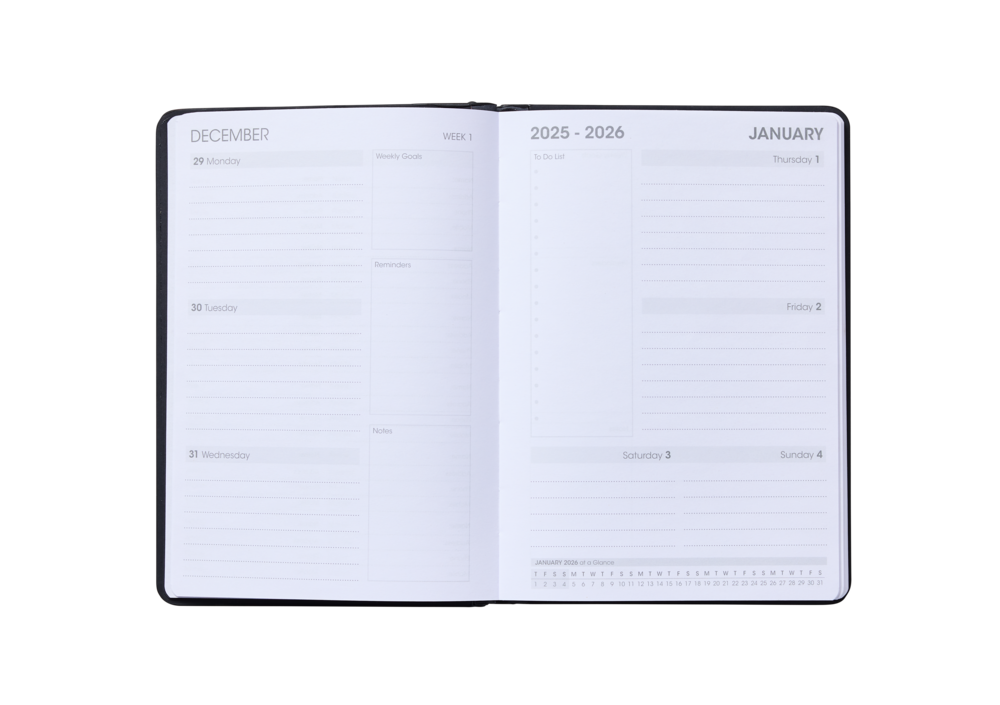 This 2026 fashionable A5 diary has a front textured PU cover with exclusive design in a week-to-view format. Diary includes New Zealand holidays in the contents section.