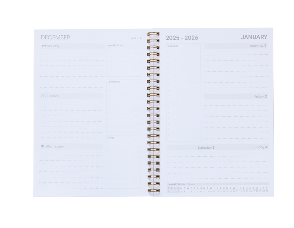 This 2026 fashionable A5 diary has a front cover with exclusive design in a week-to-view format. Diary includes New Zealand holidays in the contents section.