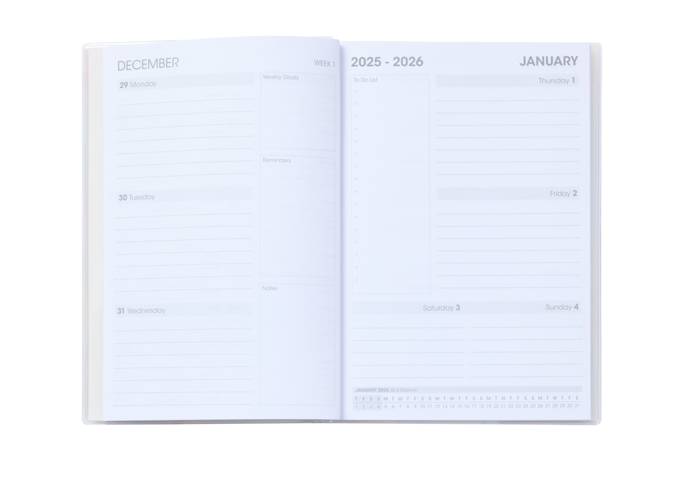 This 2026 fashionable A5 diary has a front PVC cover with exclusive design in a week-to-view format. Diary includes New Zealand holidays in the contents section.