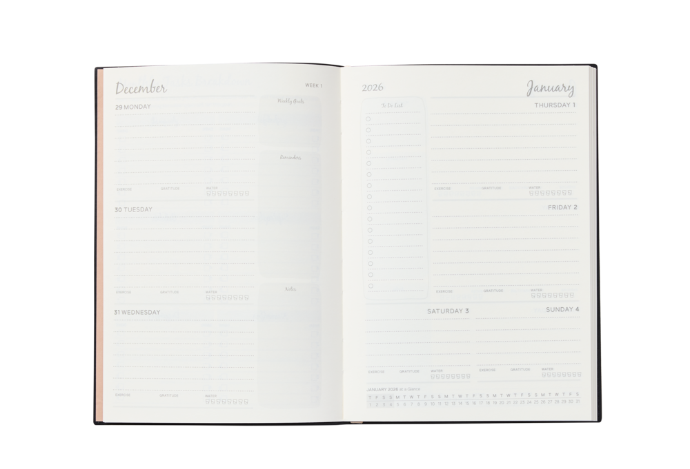 This 2026 fashionable A5 diary has a front suede feel cover with exclusive design in a week-to-view format. Diary includes New Zealand holidays in the contents section.