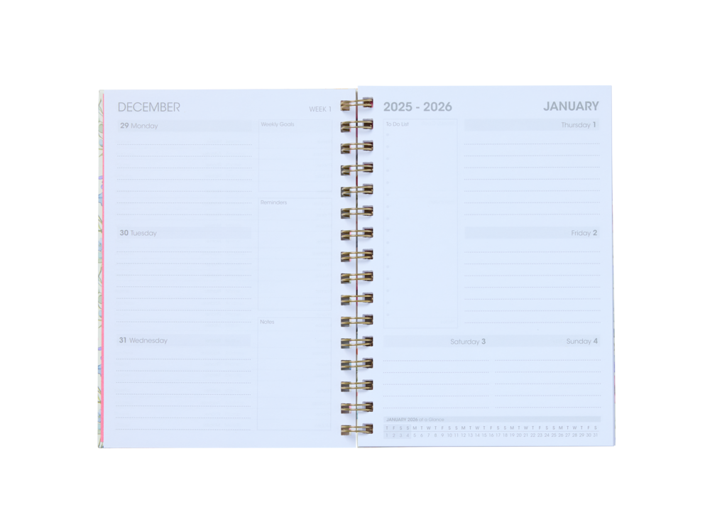 This 2026 fashionable A5 diary has a front cover with exclusive design in a week-to-view format. Diary includes New Zealand holidays in the contents section.