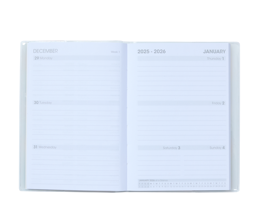 This 2026 fashionable A6 diary has a front PVC cover with exclusive design in a week-to-view format. Diary includes New Zealand holidays in the contents section.