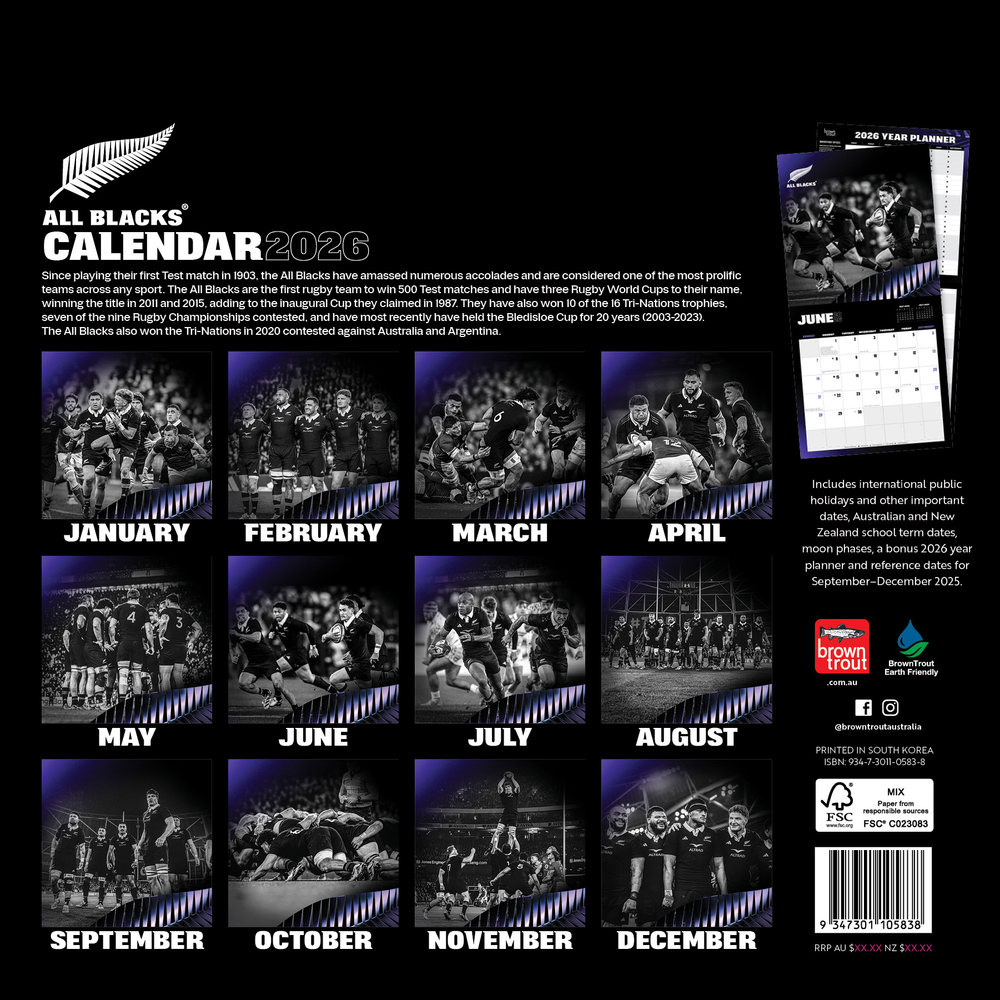 The official calendar of the All Blacks rugby world champions featuring your favourite players. Since playing their first Test match in 1903, the All Blacks have amassed numerous accolades and are considered one of the most prolific teams across any sport. The All Blacks are the first rugby team to win 500 Test matches and have three Rugby World Cups to their name, winning the title in 2011 and 2015, adding to the inaugural Cup they claimed in 1987. They have also won 10 of the 16 Tri-Nations trophies, seven of the nine Rugby Championships contested, and have most recently held the Bledisloe Cup for 20 years (2003-2023). Includes international, Australian and New Zealand public holidays and other important dates and a bonus 2026 Year Planner. Each month displays a mini date pad as reference to the previous and next months, southern hemisphere moon phases and image captions throughout. This is a 12 month calendar - January to December 2026. The 305 x 305mm (305 x 610mm open) saddle stitched square format wall calendar comes shrink wrapped with a cardboard stiffener to decrease the risk of damage in transit. Includes a drill hole so you can hang the calendar on your wall. Printed on 250gsm gloss art stock for cover and 150 gsm gloss art stock for internal pages.