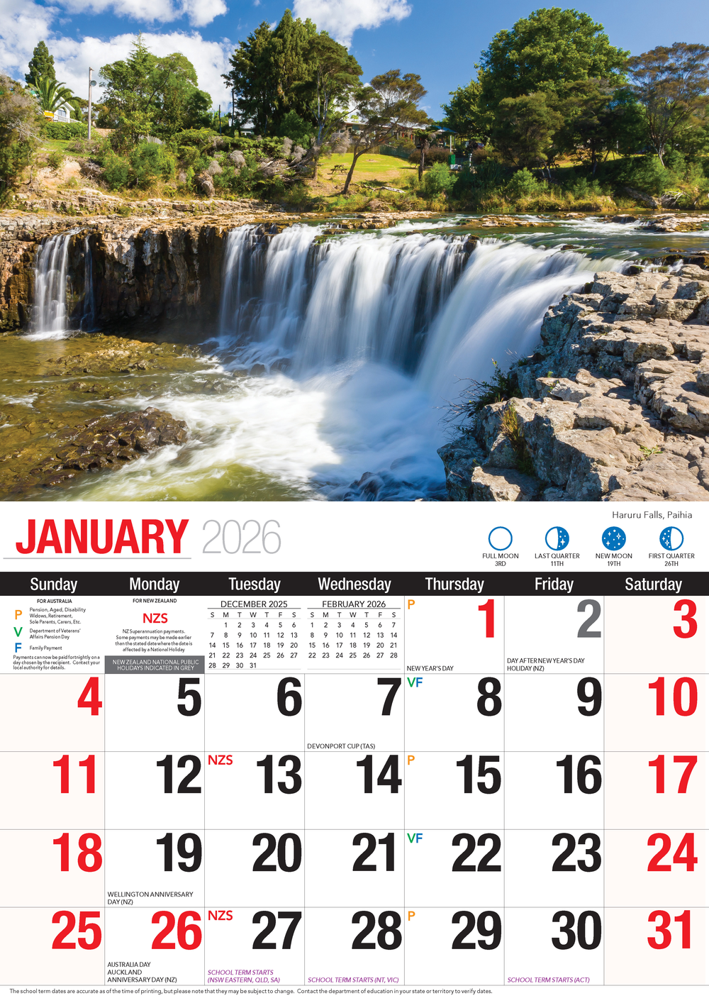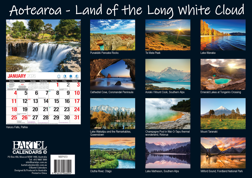 This 2026 wall calendar of Aotearoa Land of the Long White Cloud measures 297 x 210mm and includes New Zealand public holidays and school terms as well as moon phases.
