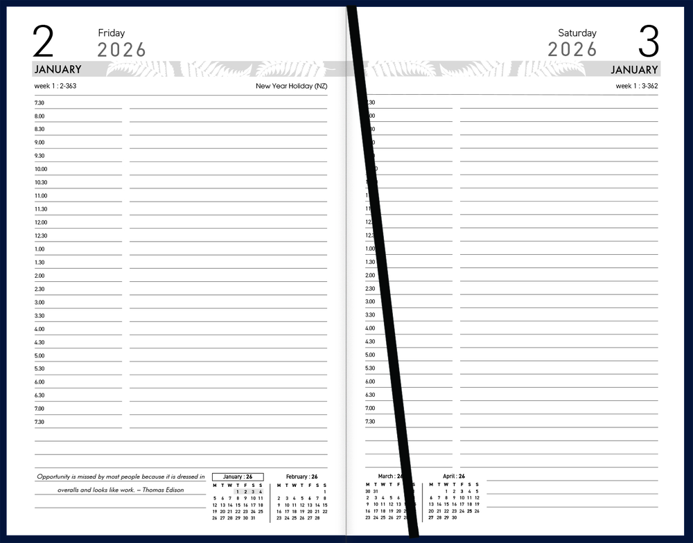 The 2026 Collins 81A Appointment day-per-page diary in black features full days half hour appointments with times starting at 7:30am and ending at 7:30pm, including Saturday and Sunday. Diary binding is sewn and has a hard, book cloth cover. This diary also includes a ribbon marker and is FSC certified.