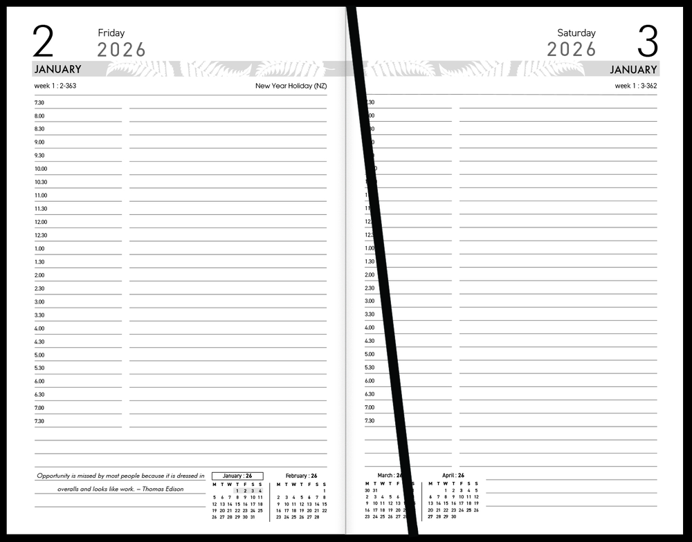 The 2026 Collins 81EA day-per-page diary in black features full days 1/2 hour appointments with times starting at 7:30am and ending at 7:30pm, including Saturday and Sunday. Diary binding is sewn and has a hard, book cloth cover. This diary also includes a ribbon marker and is FSC certified.