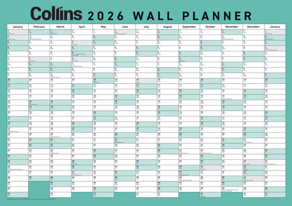 The 2026 Collins Wall Planner features 13 Months-to-View. Wall planner is double sided, one side with months along the top and days down the side, the other with days along the top and months down the side. Planner is size A2, has a textured semi-gloss finish, and FCS certified.