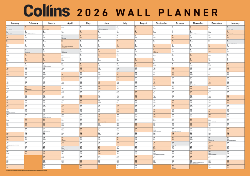 The 2026 Collins Wall Planner features 13 Months-to-View. Wall planner is double sided, one side with months along the top and days down the side, the other with days along the top and months down the side. Planner is size A3, has a textured semi-gloss finish, and FCS certified.