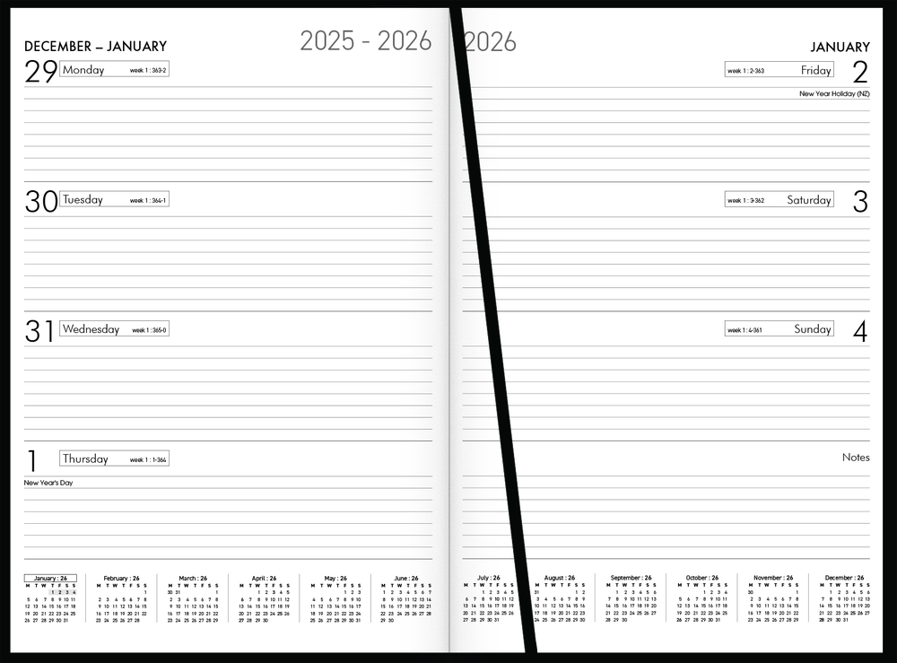 The 2026 Collins A43 week-to-view diary in black is size A4 and features a sewn binding with a hard, book cloth cover. Diary includes ribbon marker and is FSC certified.