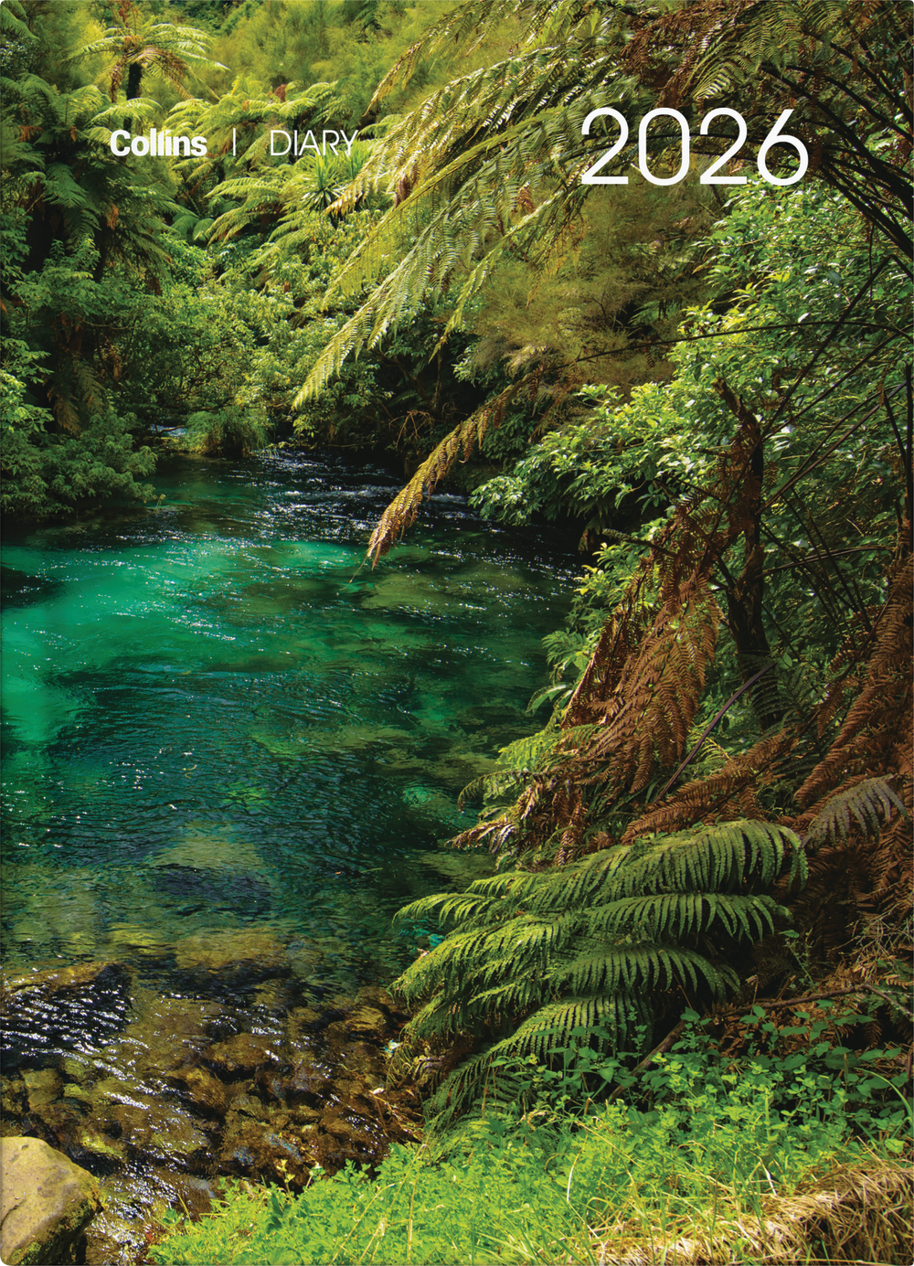 The 2026 Collins A51 day-per-page diary in New Zealand landscape design is size A5 and features full days including Saturday and Sunday. Diary binding is sewn and has a hard cover printed and laminated. This diary also includes a ribbon marker and is FSC certified.