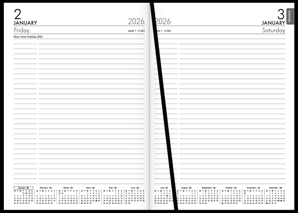 The 2026 Collins A51E day-per-page diary in black is size A5 and features full days including Saturday and Sunday. Diary binding is sewn and has a hard, book cloth cover. This diary also includes a ribbon marker and is FSC certified.