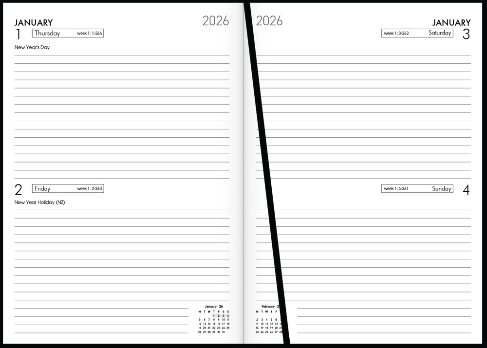 The 2026 Collins A52 two days-per-page diary in black is size A5 and features two days per page. Diary binding is sewn and has a hard, book cloth cover. This diary also includes a ribbon marker and is FSC certified.