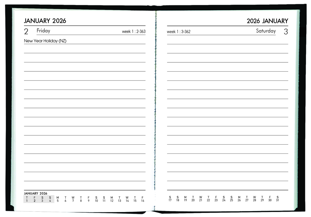 The 2026 Collins A71 day-per-page diary in black measures 105 x 74mm and features a full page per day, including Saturday and Sunday. Diary has a firm, book cloth cover and is FSC certified.