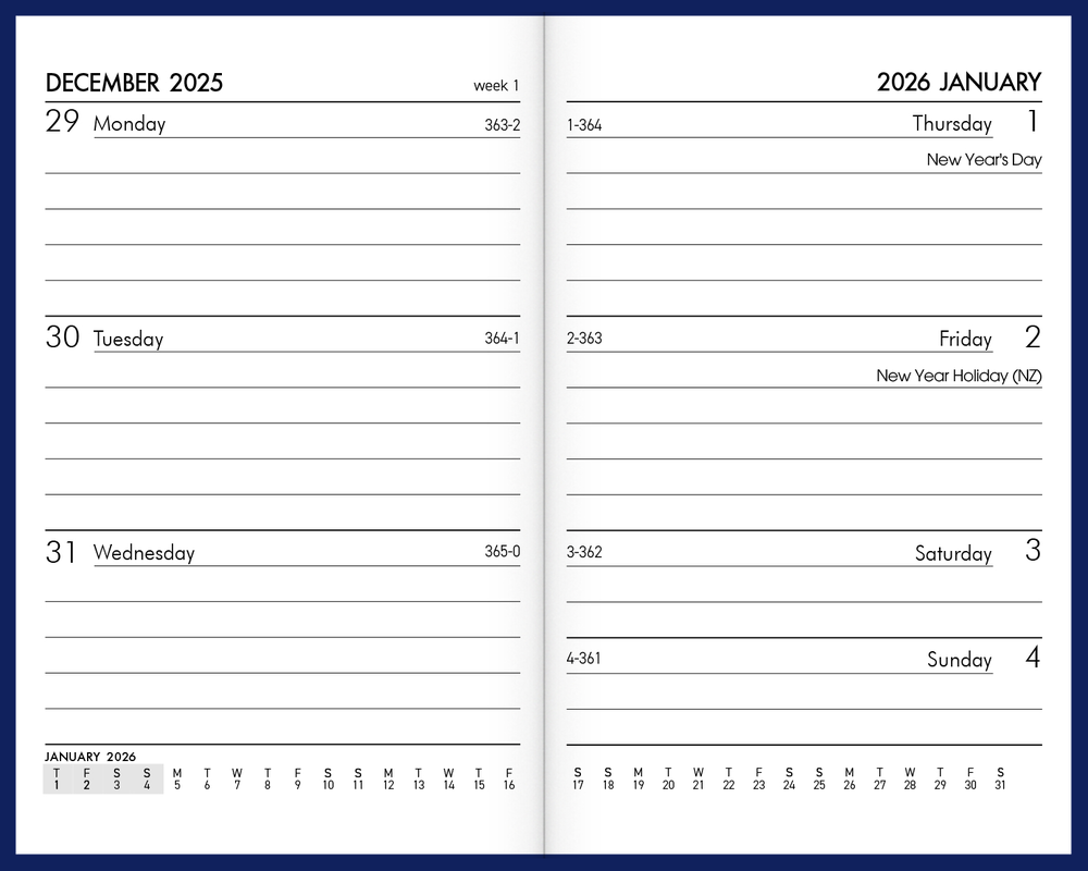 The 2026 Collins A73P week-to-view diary in navy measures 105 x 74mm and features two days-to-view per page. PVC cover and is FSC certified.