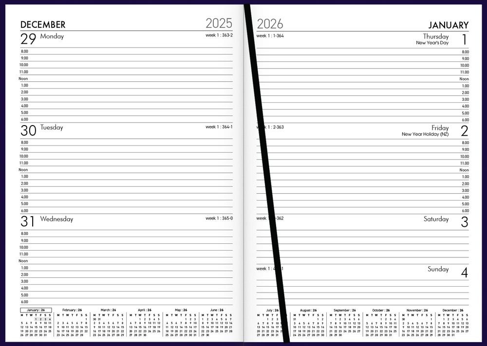 The 2026 Collins Rhapsody A53 week-to-view diary in purple is size A5 and pages feature hourly appointments starting from 8am and end at 6pm. Diary binding is sewn and cover is firm but soft touch. Includes ribbon marker. Diary is FSC certified.