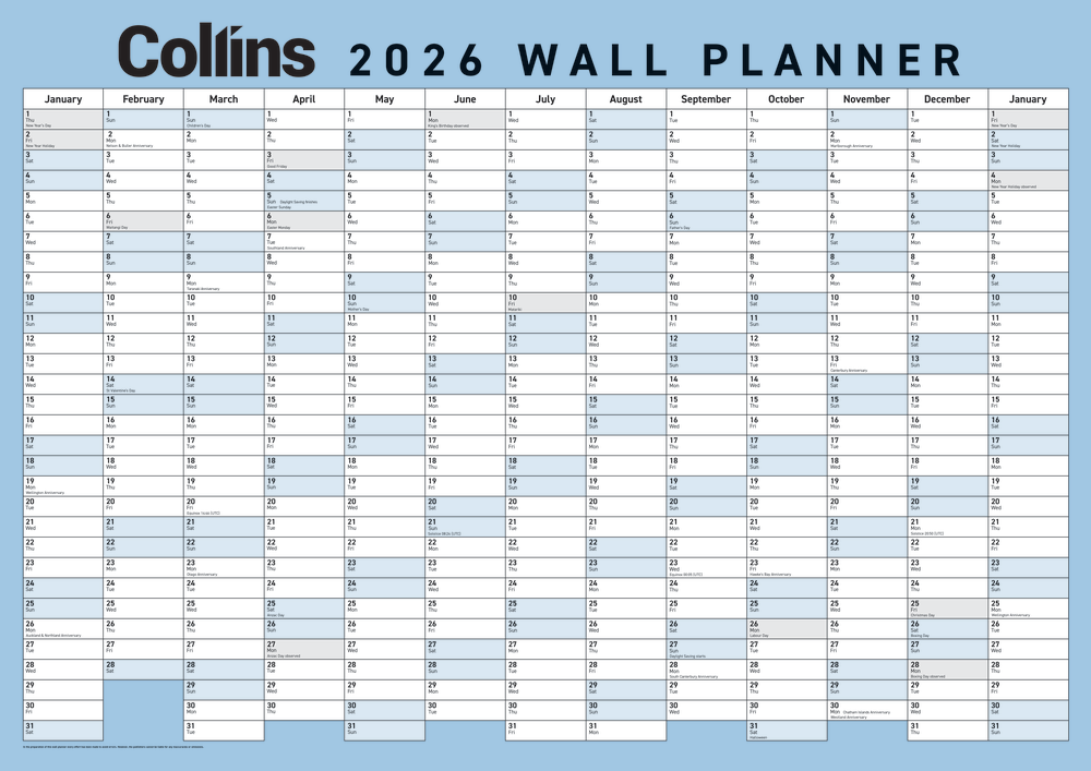 The 2026 Collins Wall Planner features 13 Months-to-View. Wall planner is double sided, one side with months along the top and days down the side, the other with days along the top and months down the side. The wall planner measures 700 x 900mm, is laminated and is also FCS certified.