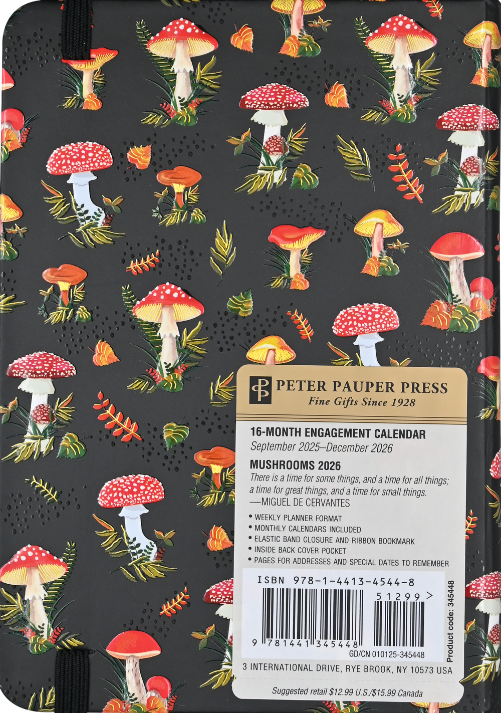 Stay grounded and organized with this beautifully illustrated Mushrooms-themed planner, thoughtfully designed to keep your weeks running smoothly. Featuring a 7-day week-at-a-glance layout across a two-page spread, this planner gives equal space to every day perfect for noting appointments, to-dos, and weekend plans. Covering 16 months from September 2025 through December 2026, it includes monthly overview pages, mini reference calendars for the current and upcoming month, and helpful notations for holidays, observances, and lunar phases. There#s also space to record contact details and important dates to remember. Crafted with 120 gsm acid-free, archival-quality paper, this planner is both durable and elegant. The sturdy hardcover is embossed and enhanced with gold foil and gloss highlights, making it a stylish and functional companion. A ribbon bookmark, elastic closure, and back cover pocket add practical touches to keep everything in place. Measuring approximately 127 mm x 178 mm, it#s lightweight and compact ideal for slipping into your bag or backpack.