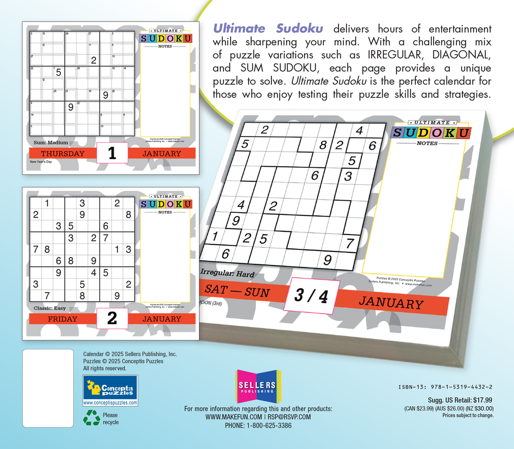 Ultimate sudoku provides hours of entertainment while sharpening your mind. With a mix of puzzle variations to challenge all levels, such as IRREGULAR, DIAGONAL, and SUM SUDOKU, each page provides a unique puzzle to solve. Ultimate Sudoku is the perfect calendar for those who enjoy testing their puzzle skills and strategies.