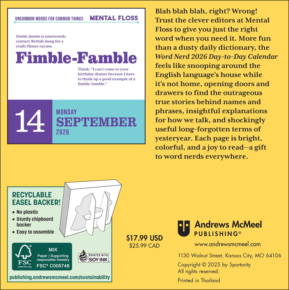 Mental Floss's Word Nerd 2026 Day-to-Day Calendar is the fun-lover's choice for daily wordplay, phrase origins, and light-to-heavy logophilia. From spotlighting linguistic curios and archaic insults to decoding generational slang and uncovering the odd origins of quirky idioms, Mental Floss's Word Nerd 2026 Day-to-Day Calendar shows us the fascinating, funny, and occasionally foul-mouthed stories behind how we say what we mean and mean what we say. Each page features a new word, phrase origin, or fun and fascinating fact about language, with categories including Oldies but Goodies, What in the Word?, Period Pieces, Spectacular Vernacular, Creature Features, Memorable Eponyms, Uncommon Words for Common Things, Happy Holidays, and more. Calendar includes a recyclable chipboard easel backer for desk or tabletop display. This calendar is printed on FSC-certified paper with soy-based ink and as it has full-colour, tear-off pages, the back of pages are blank for notes or shopping lists. Includes official major holidays and observances.