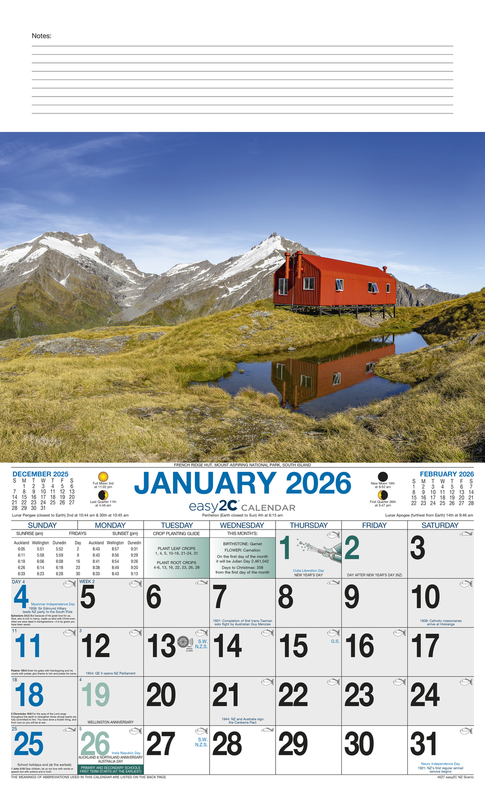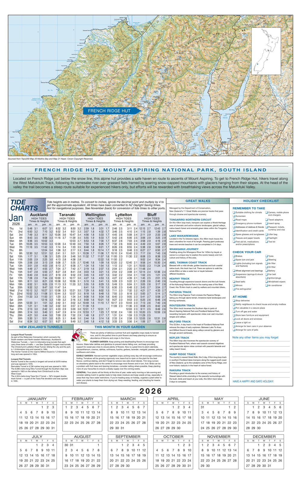 The scenic wall calendar has it all: dates of interest, superannuation payment dates, sunrise and sunset times, tide charts, crop planting and fishing guides, and much, much more. Each page features a quintessentially Kiwi landscape, and the reverse of each page offers further information including a map and a short description of each location.