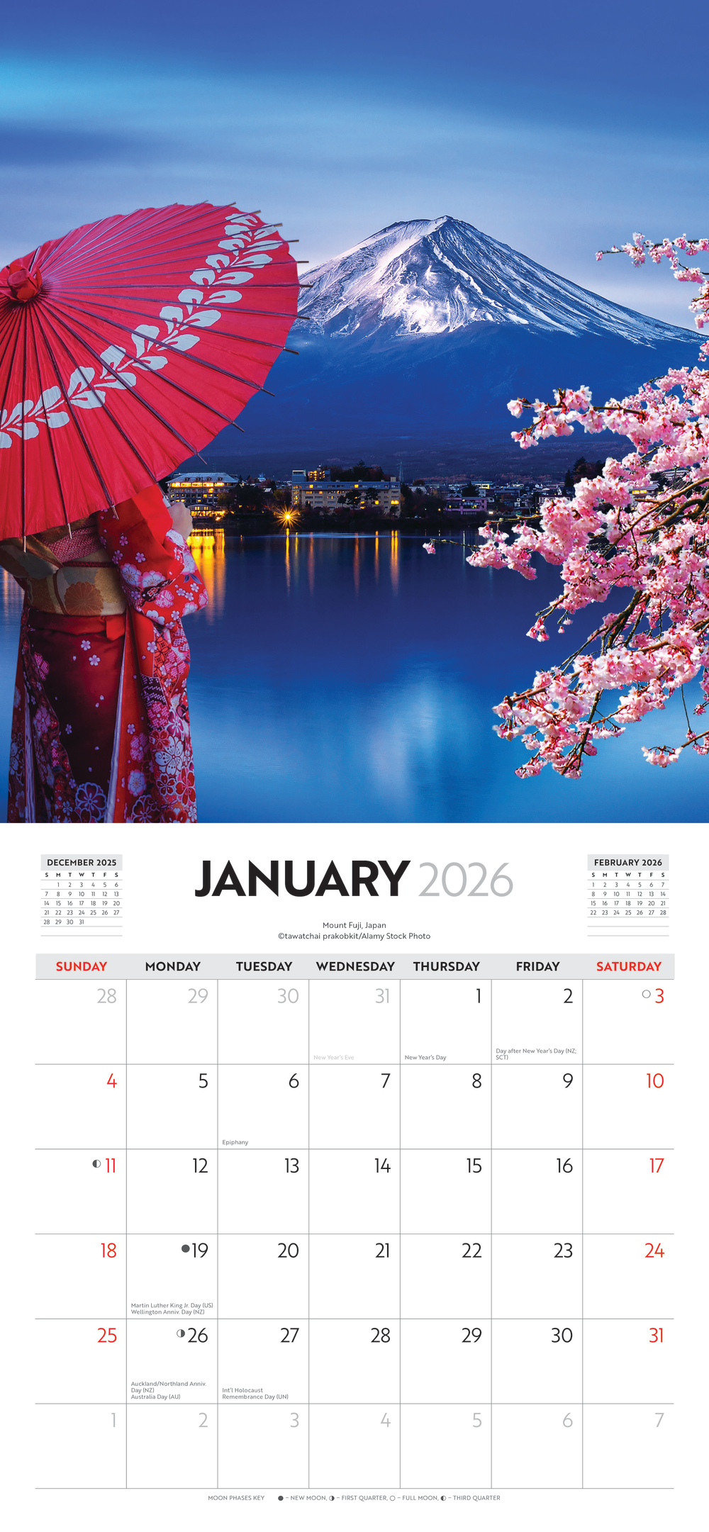 For the travel enthusiast, featuring 12 popular and amazing destinations, including Hamney Lofoten in Norway, Avenue of the Baobabs in Madagascar, Liguria in Italy, Giza pyramid complex in Cairo, Egypt and Araoki/Mount Cook in New Zealand. Includes International, National and Regional Australian and New Zealand Public Holidays and other important dates, a bonus 2026 Year Planner and September 2024 - December 2024 and January 2026 - June 2026 'At a Glance' reference dates. Each month displays a mini date pad as reference to the previous and next months, southern hemisphere moon phases, space for daily entries and additional notes and image captions throughout. This is a 12 month calendar - January to December 2026. The 305 x 305mm (305 x 610mm open) saddle stitched square format wall calendar comes shrink wrapped with a cardboard stiffener to decrease the risk of damage in transit. Includes a drill hole so you can hang the calendar on your wall. Printed on 250gsm gloss art stock for cover and 150 gsm gloss art stock for internal pages.