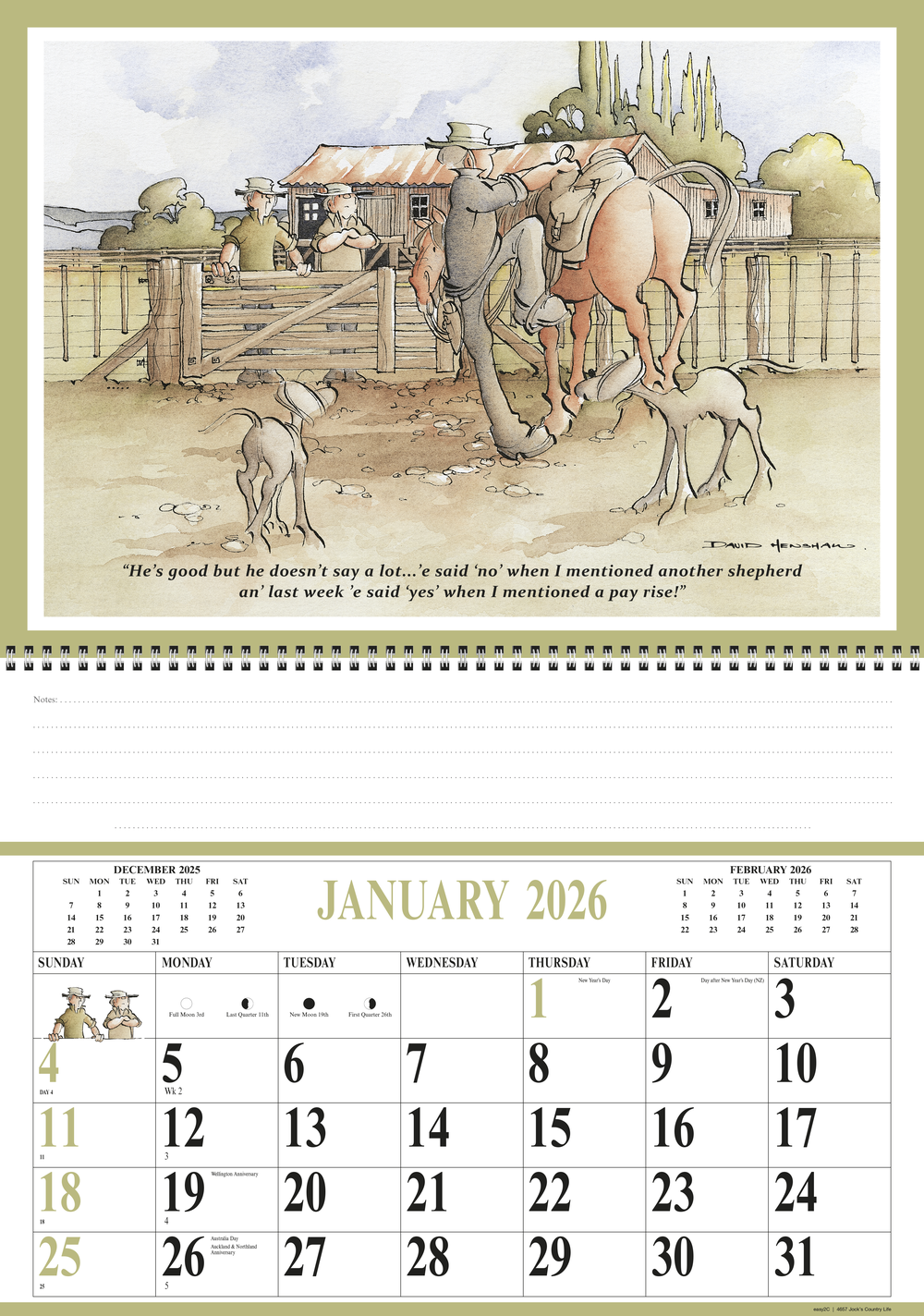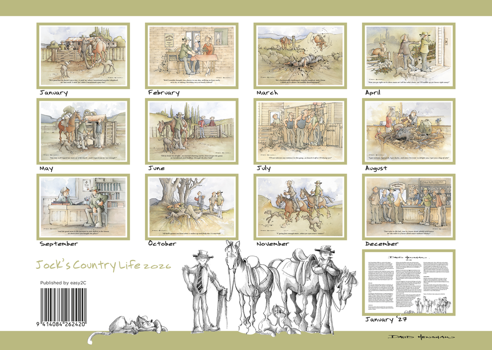 Showcasing comical illustrations from New Zealand artist David Henshaw with tongue-in-cheek commentary on the ups and downs of rural life, planning your year was never so much fun! With quintessentially Kiwi flavour, this 2026 booklet calendar offers a large date pad for each month, with plenty of room to add your own notes and an artist biography.