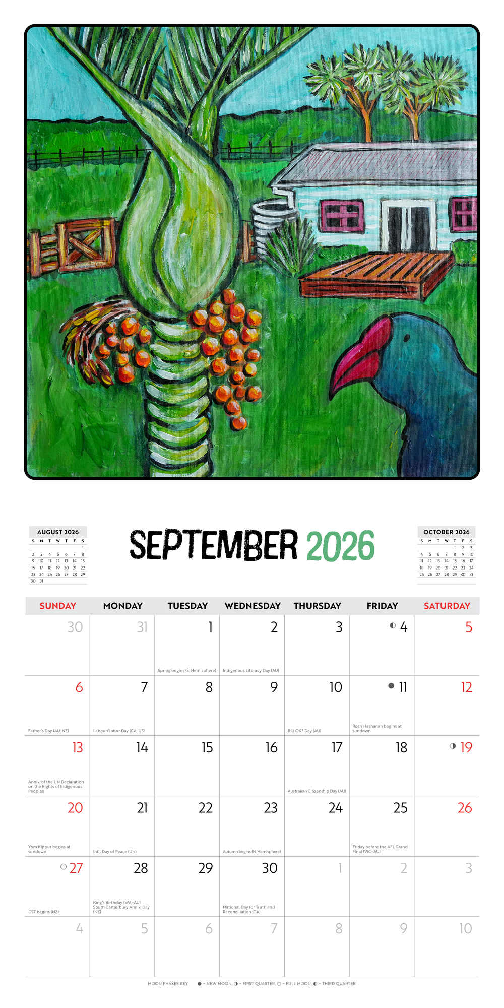12 of Jody G's original and newly painted, bold and bright coloured, iconic paintings of New Zealand. Includes international, national and regional Australian and New Zealand public holidays and other important dates, school term dates for Australia and New Zealand, a bonus 2026 year planner and September 2024 - December 2024 At a Glance reference dates. Each month displays a mini date pad as reference to the previous and next months, southern hemisphere moon phases and image captions throughout. This is a 12 month calendar - January to December 2026. The 305 x 305mm (305 x 610mm open) saddle stitched square format wall calendar comes shrink wrapped with a cardboard stiffener to decrease the risk of damage in transit. Includes a drill hole so you can hang the calendar on your wall. Printed on 250gsm gloss art stock for cover and 150 gsm gloss art stock for internal pages.