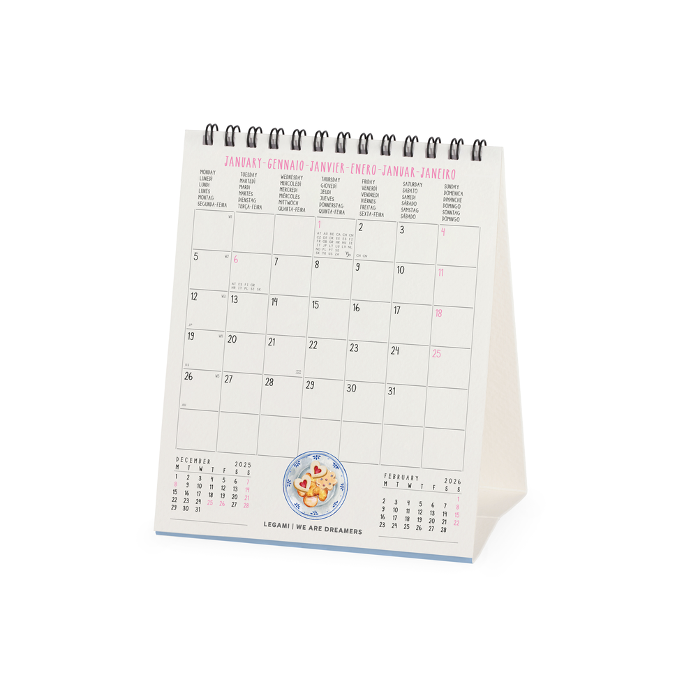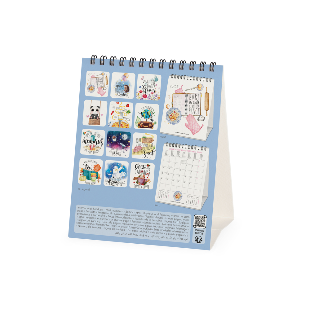 This 2026 desk calendar from Legami features aphorisms displayed throughout 12 months. Calendar includes a 2026 year planner and grid with zodiac signs and international holidays. The previous and following month on each page as well as week numbers. Calendar measures 12 x 14.5cm.