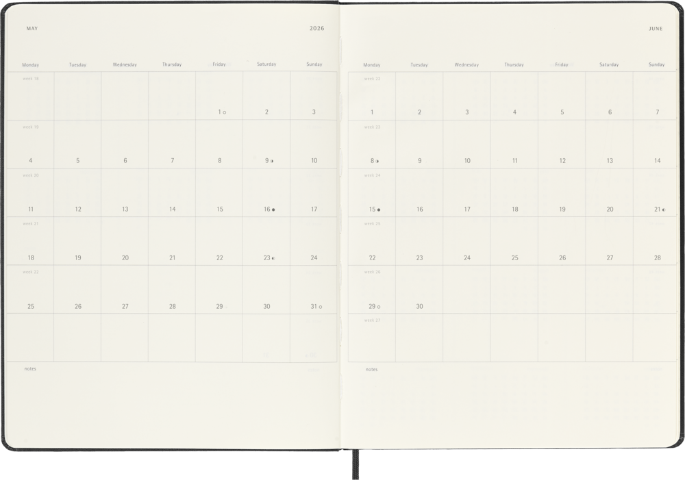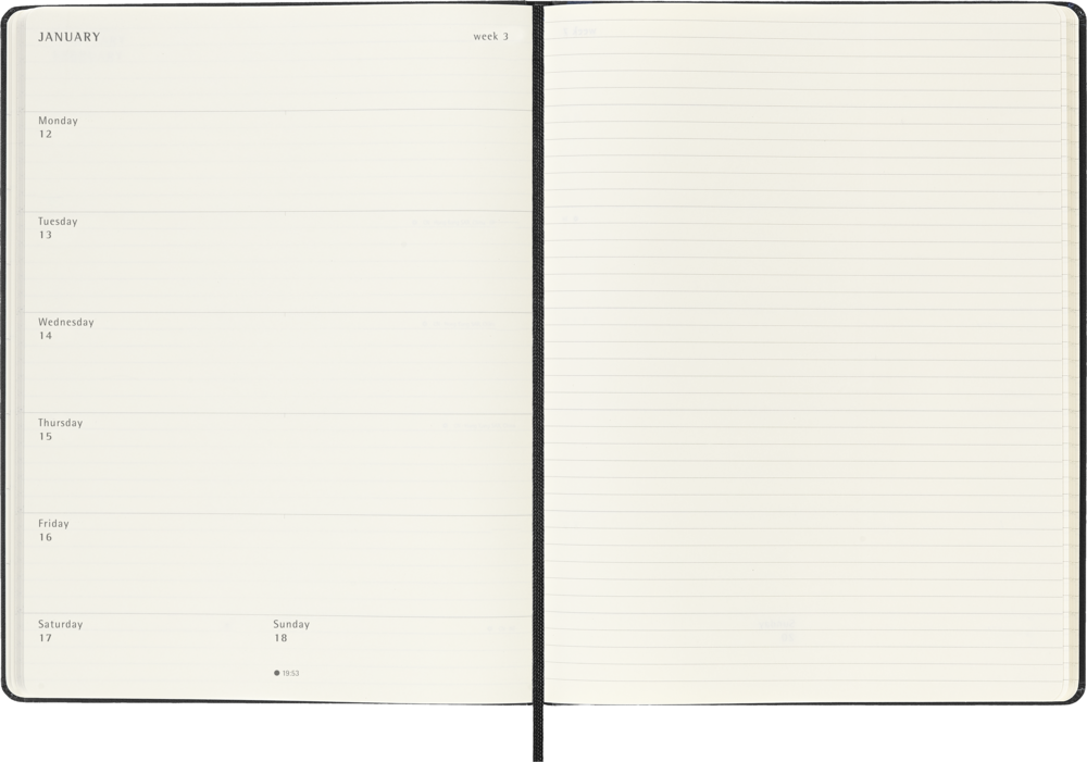 The 2026 Moleskine week-to-view hard cover diary in black measures 190 x 250mm and features a week#s appointments at a glance on the left, a ruled page for notes and ideas on the right. Diary has a hard cover with year debossed on front. Paper is ivory-coloured, 70gsm, and acid-free. Includes useful tools such as a calendar, travel planning, ideas and goals. There is also a colour-coordinated expandable inner pocket.