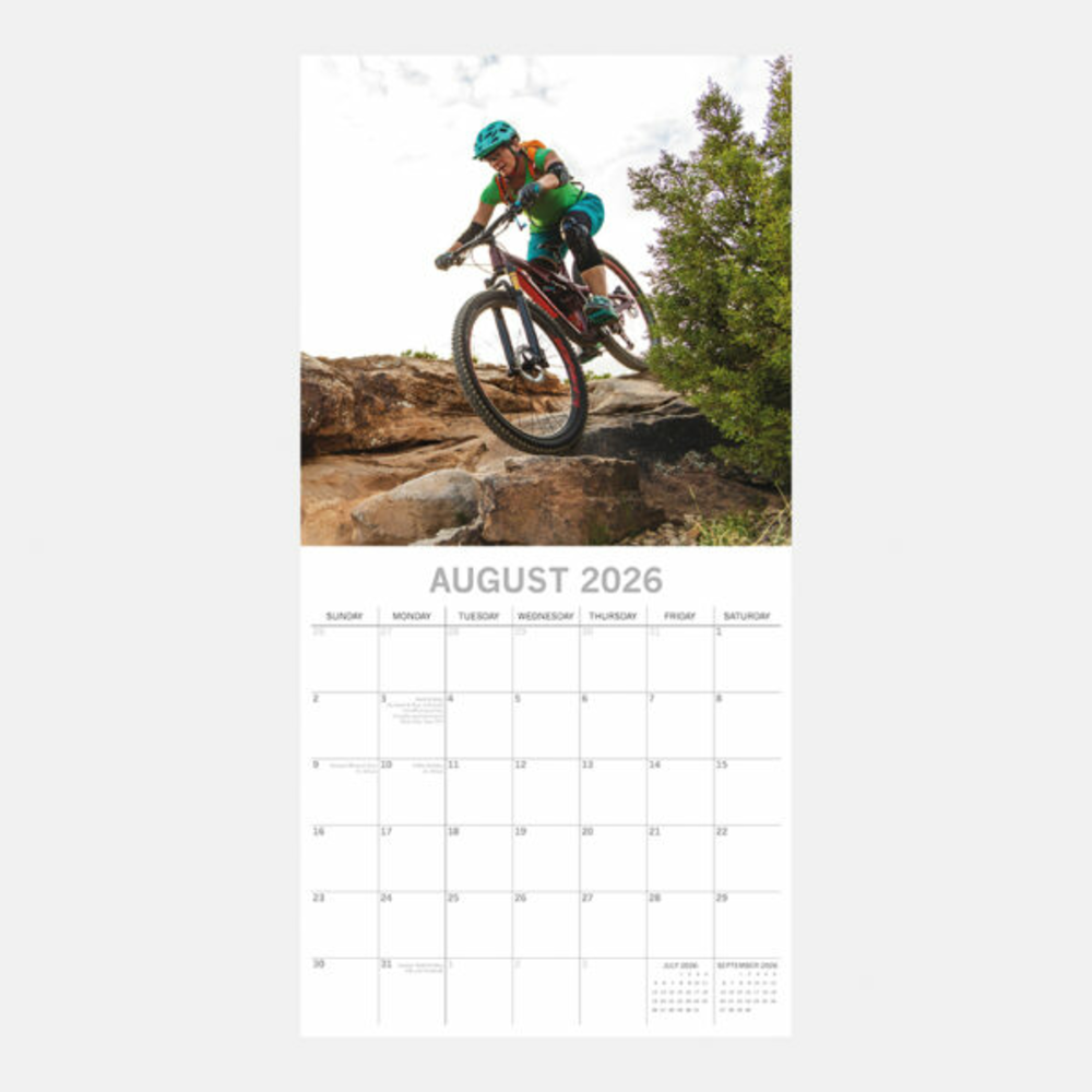 The 2026 wall calendar of mountain biking is 100% plastic free and 100% recyclable. Front cover is extended to fold over and is secured on back cover with and measures 300 x 300mm.