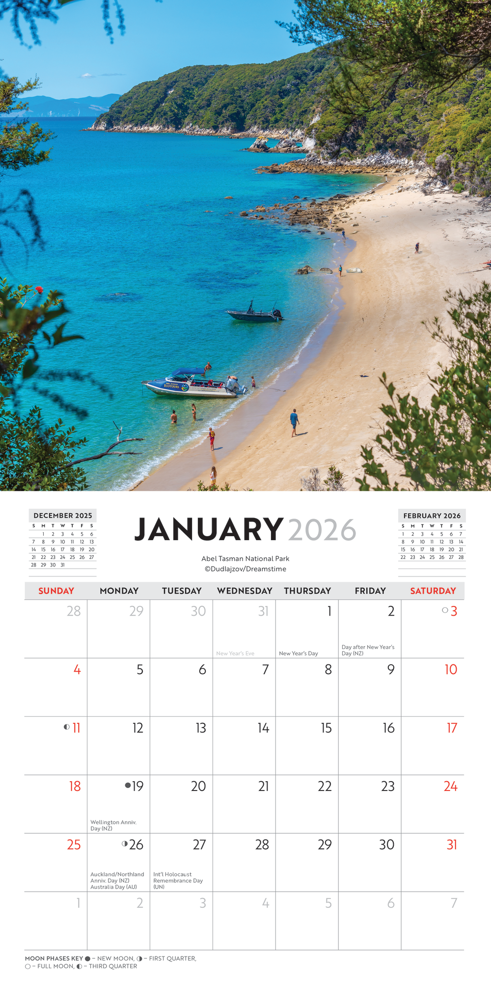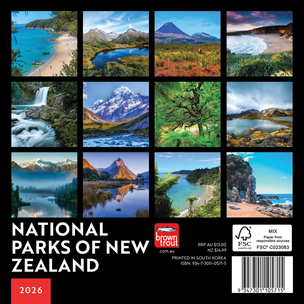 A stunning mini format calendar including 13 images of New Zealand's breathtaking National Parks. Featuring Westland Tai Poutini, Paparoa, Nelson Lakes and Mount Egmont National Parks. The 178 x 178mm (178 x 356mm open) saddle stitched mini square format wall calendar comes shrink wrapped with a cardboard stiffener to decrease the risk of damage in transit when sending to friends and family. Drill hole included so you can hang the calendar on your wall. Includes International, National and Regional Australian and New Zealand Public Holidays and other important dates, Australian and New Zealand school term dates and 2026 At-A-Glance dates. Each month displays a mini date pad as reference to the previous and next months, southern hemisphere moon phases, space for daily entries and additional notes and image captions throughout. This is a 12 month calendar - January to December 2026. Printed on 250gsm gloss art stock for cover and 150gsm gloss art stock for internal pages.