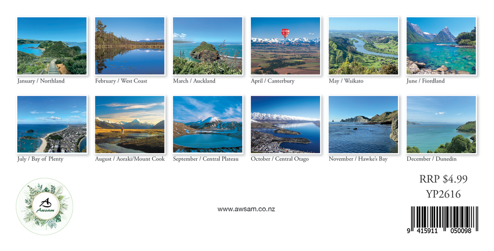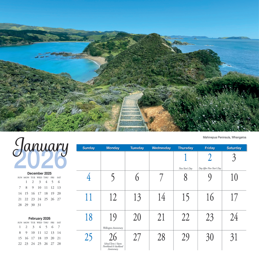 This 2026 Compact calendar features 12 beautiful scenes from around New Zealand. Each page includes previous month and next month preview.