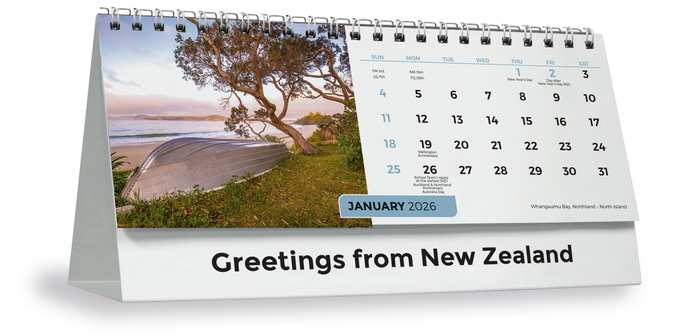 With a modern design and stunning New Zealand landscape imagery, this compact desk calendar is the perfect planner to keep on your office desk or by the telephone, to help you plan your year without taking up too much space. Each month features tow distinct date pads, with room to note birthdays, appointments and other vital information.