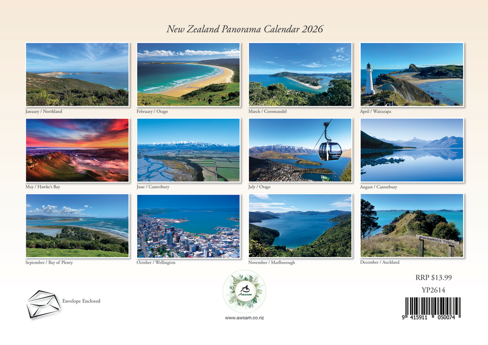 This 2026 A4 wall calendar captures 12 panorama shots of New Zealand's landscapes and sights. On the inside back cover, find interesting information about New Zealand and facts about mountains/peaks, lakes and rivers. Calendar includes an envelope for ease of sending as a gift.