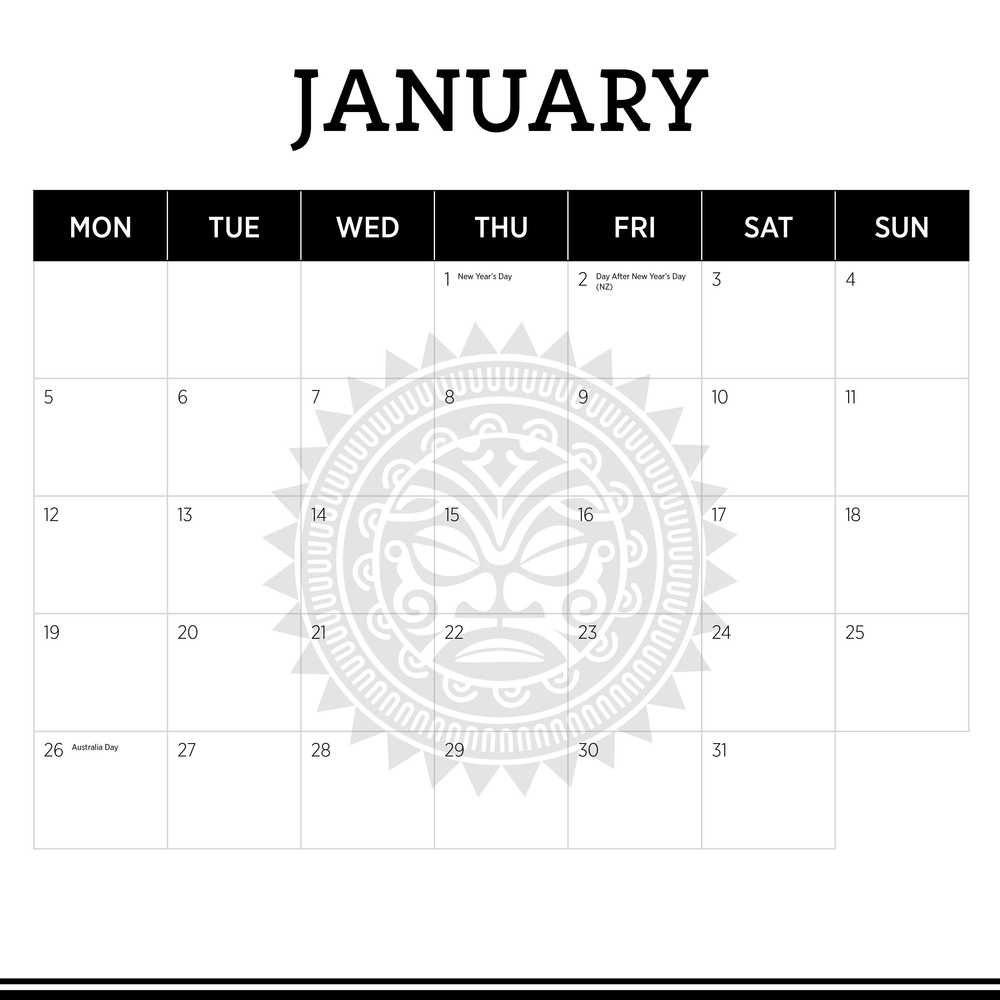 - Each week displayed in the calendar begins on a Monday, all major Public Holidays and 2026 School Term dates for Australian and New