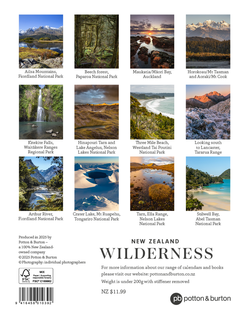 A small vertical format calendar of stunning wilderness images of New Zealand. Calendar features photo per month with, month date pad. Includes holidays, important dates, moons, school terms, and mini-pads of 2026 and 2027 as well as an envelope to make overseas gifting easy. Calendar measures 220 x 175mm.