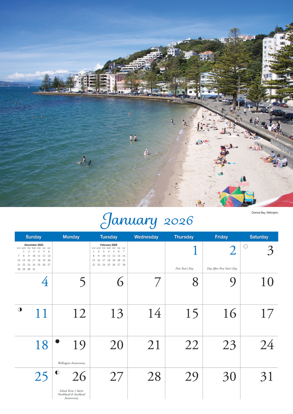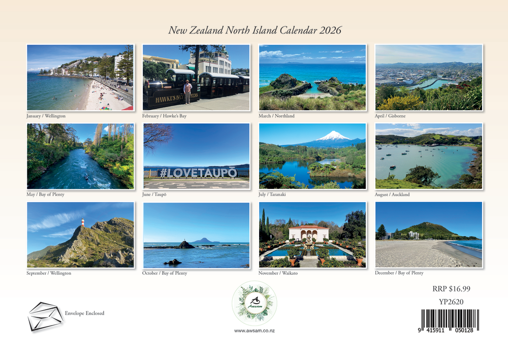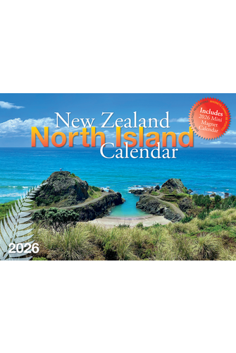 This 2026 A4 wall calendar that includes a mini magnetic calendar, depicts 12 beautiful landscapes and scenes from around the North Island of New Zealand. On the inside back cover, find interesting information about New Zealand and facts about mountains/peaks, lakes and rivers. Calendar includes a 2026 mini magnetic calendar and an envelope for ease of sending as a gift. Due to New Zealand Post regulations, magnets cannot be posted.