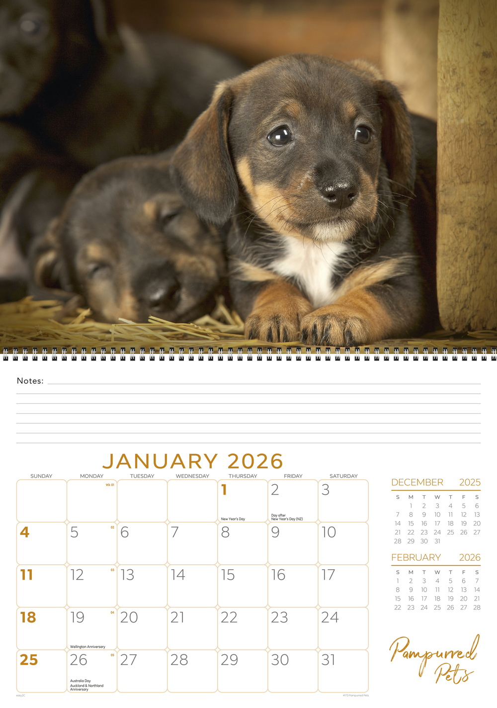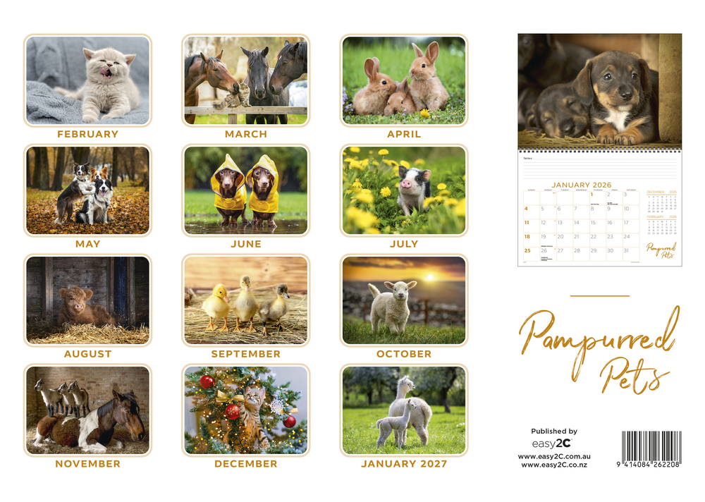 Fill your year with endless fuzzy moments with this adorable pet calendar! Each month features a heartwarming image of cute and lovable animal that is sure to brighten your day. Whether you're a cat person, a dog lover, or a fan of all things furry, this calendar brings a dose of joy, cuteness, and charm to every page. Let these pampurred pets keep you company all year long! The date pad features public holidays, week numbers, and there's even a bonus January 2027 page to lead you into the new year.