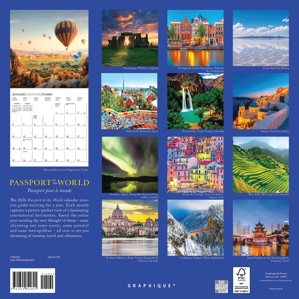 The 2026 Passport to the World calendar takes you globe-trotting for a year. Each month captures a picture-perfect view of a fascinating international destination. Spend the entire year savouring the very thought of them # some charming and some exotic, some pastoral and some metropolitan # all sure to set you dreaming of faraway travel and adventure.