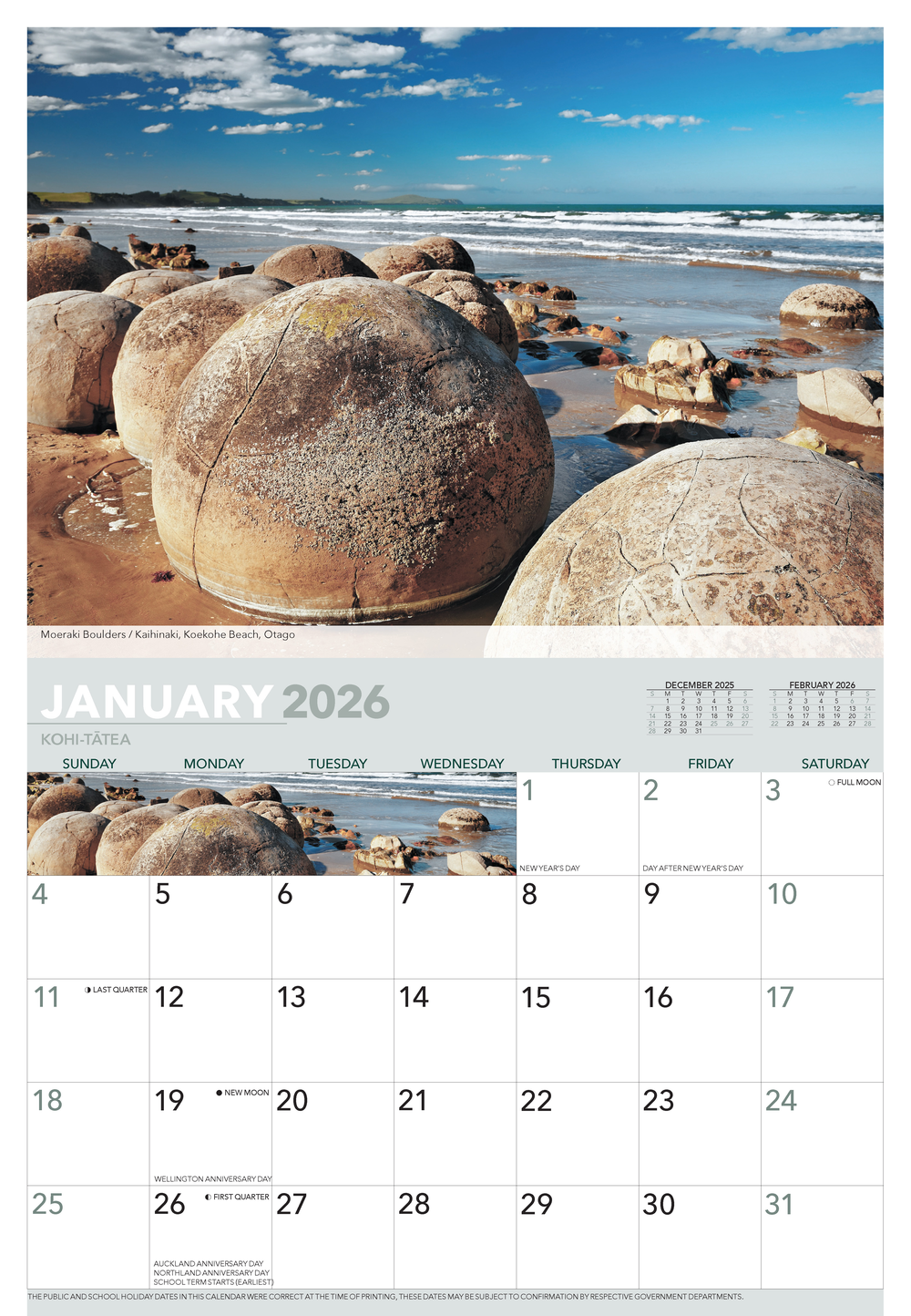This 2026 wall calendar features landscapes of New Zealand and measures 355 x 242mm. Calendar includes New Zealand public holidays and school terms as well as moon phases. It also includes an envelope.