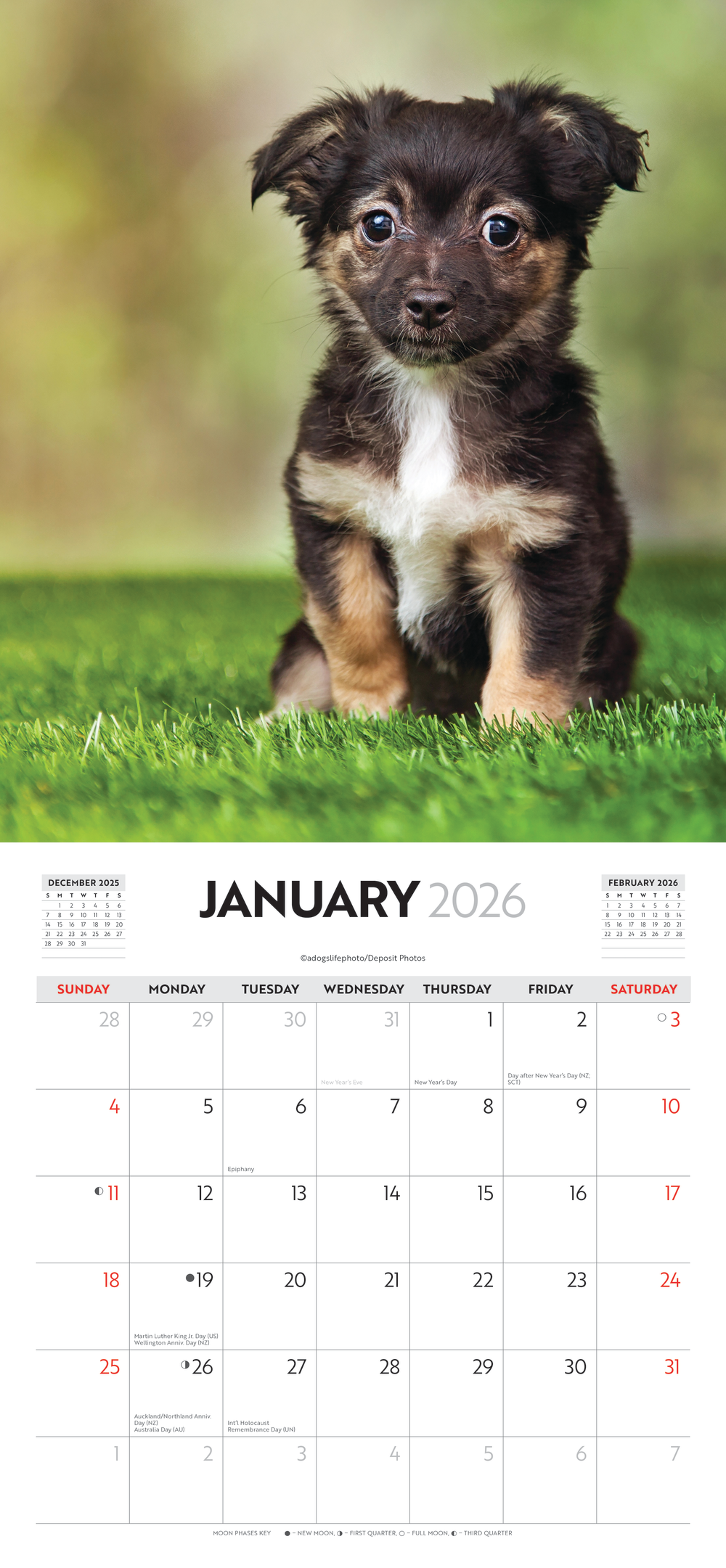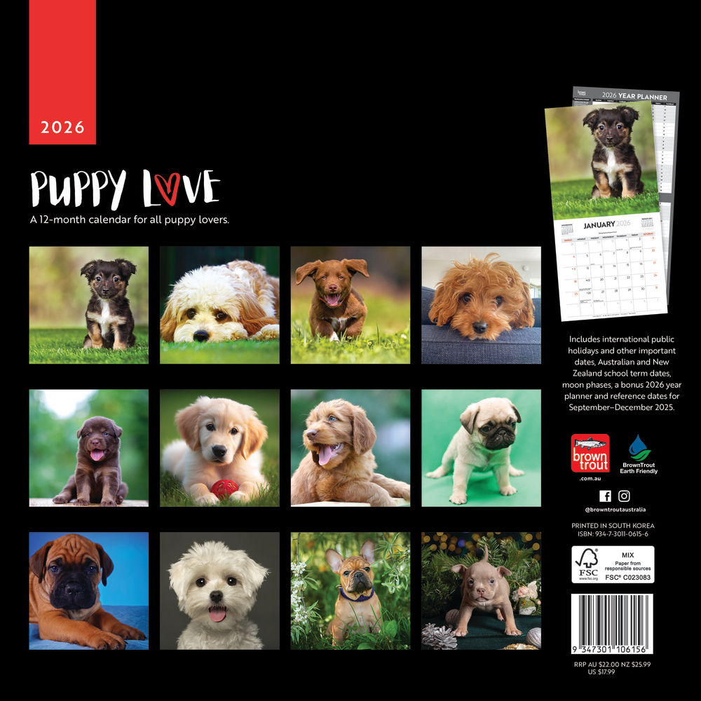 A cute calendar featuring puppies of all shapes and sizes, including Chihuahua, Golden Retriever, Jack Russell and Australian Shepherd puppies. The perfect gift for all dog lovers! Includes international, national and regional Australian and New Zealand Public Holidays and other important dates, a bonus 2026 year planner and September 2024- December 2024 and January 2026 - June 2026 'At a Glance' reference dates. Each month displays a mini date pad as reference to the previous and next months and southern hemisphere moon phases and space for daily entries and additional notes throughout. This is a 12 month calendar - January to December 2026. The 305 x 305mm (305 x 610mm open) saddle stitched square format wall calendar comes shrink wrapped with a cardboard stiffener to decrease the risk of damage in transit. Includes a drill hole so you can hang the calendar on your wall. Printed on 250gsm gloss art stock for cover and 150 gsm gloss art stock for internal pages.