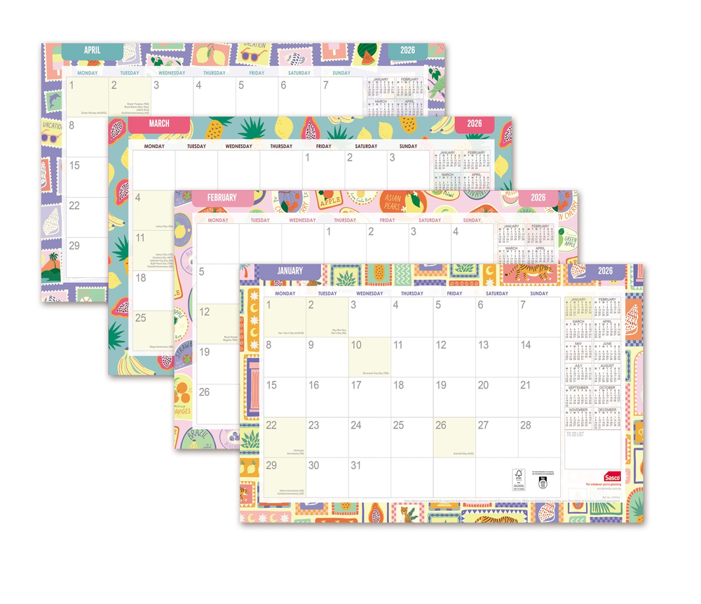 Keep up to date and in control of your planning with a 2026 Sasco fashion desk planner, featuring a lovely patterned border. Includes key Australian and New Zealand public holidays and school terms. Please note as this is an assorted item, you will receive a randomly selected design/colour for online orders.