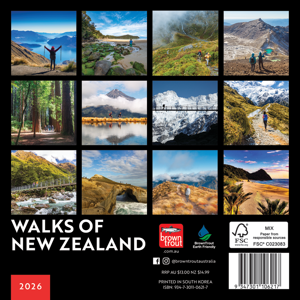 This calendar features a collection of amazing walks through the New Zealand landscapes - Rakiura Track, Abel Tasman Coastal Track, Sealy Tarns Track, Tunnel Beach Walk, Kepler Track and the Tongariro Alpine Crossing. The 178 x 178mm (178 x 356mm open) saddle stitched mini square format wall calendar comes shrink wrapped with a cardboard stiffener to decrease the risk of damage in transit when sending to friends and family. Drill hole included so you can hang the calendar on your wall. Includes International, National and Regional Australian and New Zealand Public Holidays and other important dates, Australian and New Zealand school term dates and 2027 At-A-Glance dates. Each month displays a mini date pad as reference to the previous and next months, southern hemisphere moon phases, space for daily entries and additional notes and image captions throughout. This is a 12 month calendar - January to December 2026.