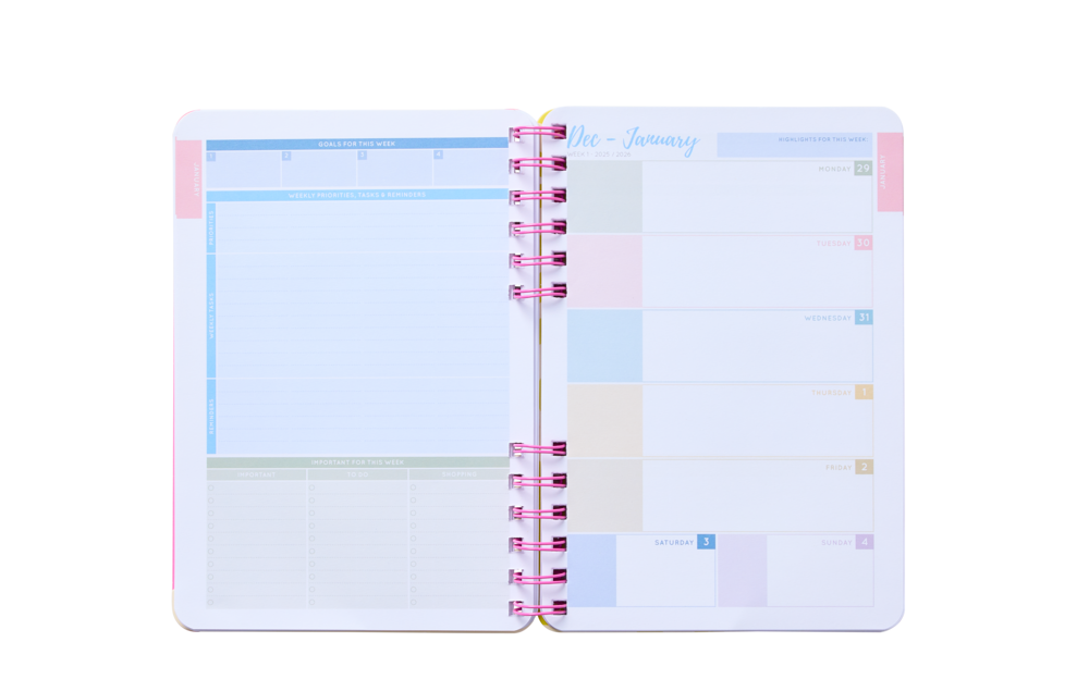 This 2026 fashionable diary has a front cover with exclusive design in a week-to-view format. Diary measures 148 x 213mm and includes New Zealand holidays in the contents section.