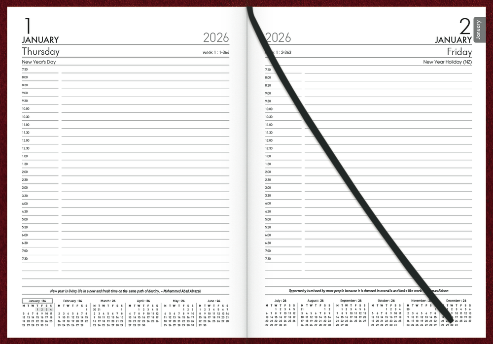 The 2026 Whitcoulls A51 day-per-page diary in red is size A5 includes appointment times on pages and features an extensive information section. Diary is adhesive bound and has PVC coated paper cover.