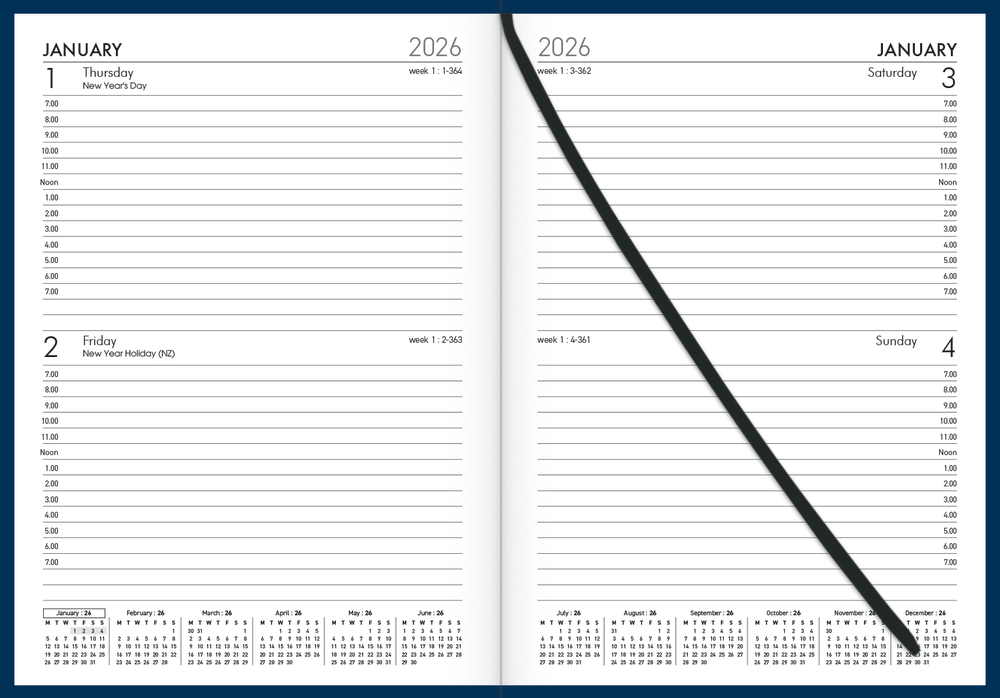 The 2026 Whitcoulls A52 two days-per-page diary in blue is size A5 includes appointment times on pages and features an extensive information section. Diary is adhesive bound and has PVC coated paper cover.